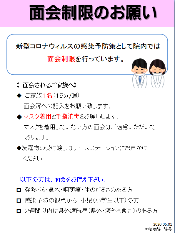 外来受診・面会の方は 西崎病院1階正面玄関より出入りお願いします。