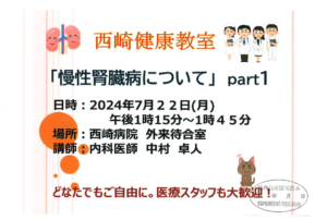 西崎健康教室のお知らせ 2024年7月8日 西崎健康教室のお知らせ 令和6年7月22日(金)午後1時15分~1時45分 外来待合室にて西崎健康教室をおこないます。 今回のテーマは 『慢性腎臓病について』part1 西崎病院 内科医師 中村 卓人 どなたでもご自由に。医療スタッフも大歓迎! 一覧へ戻る