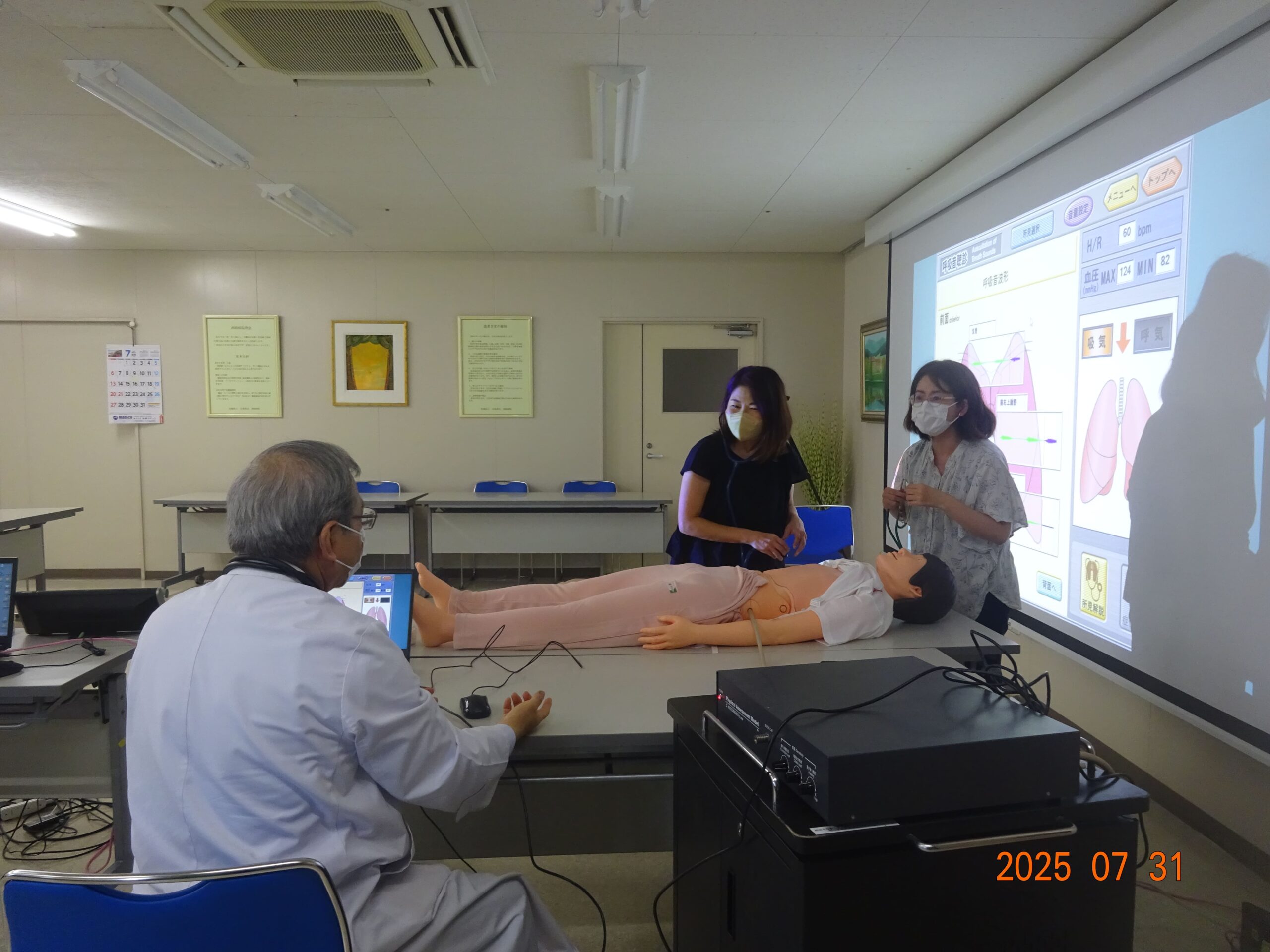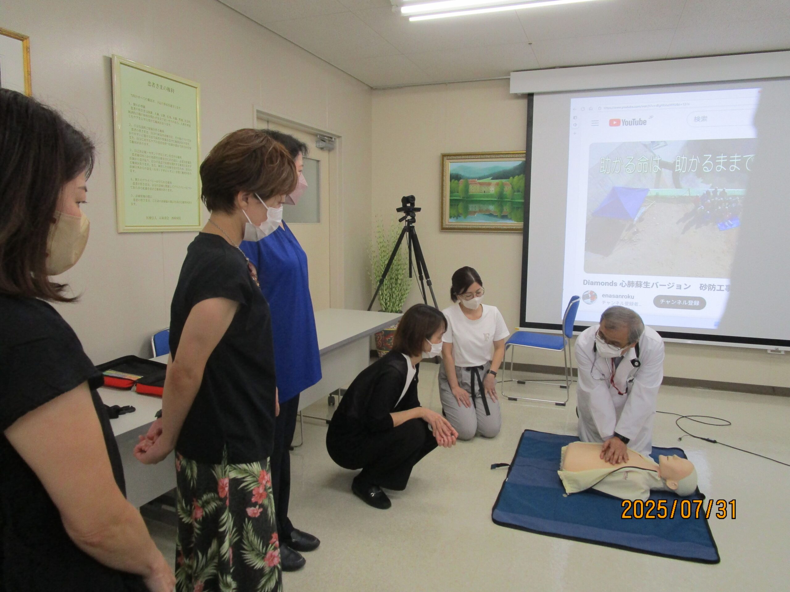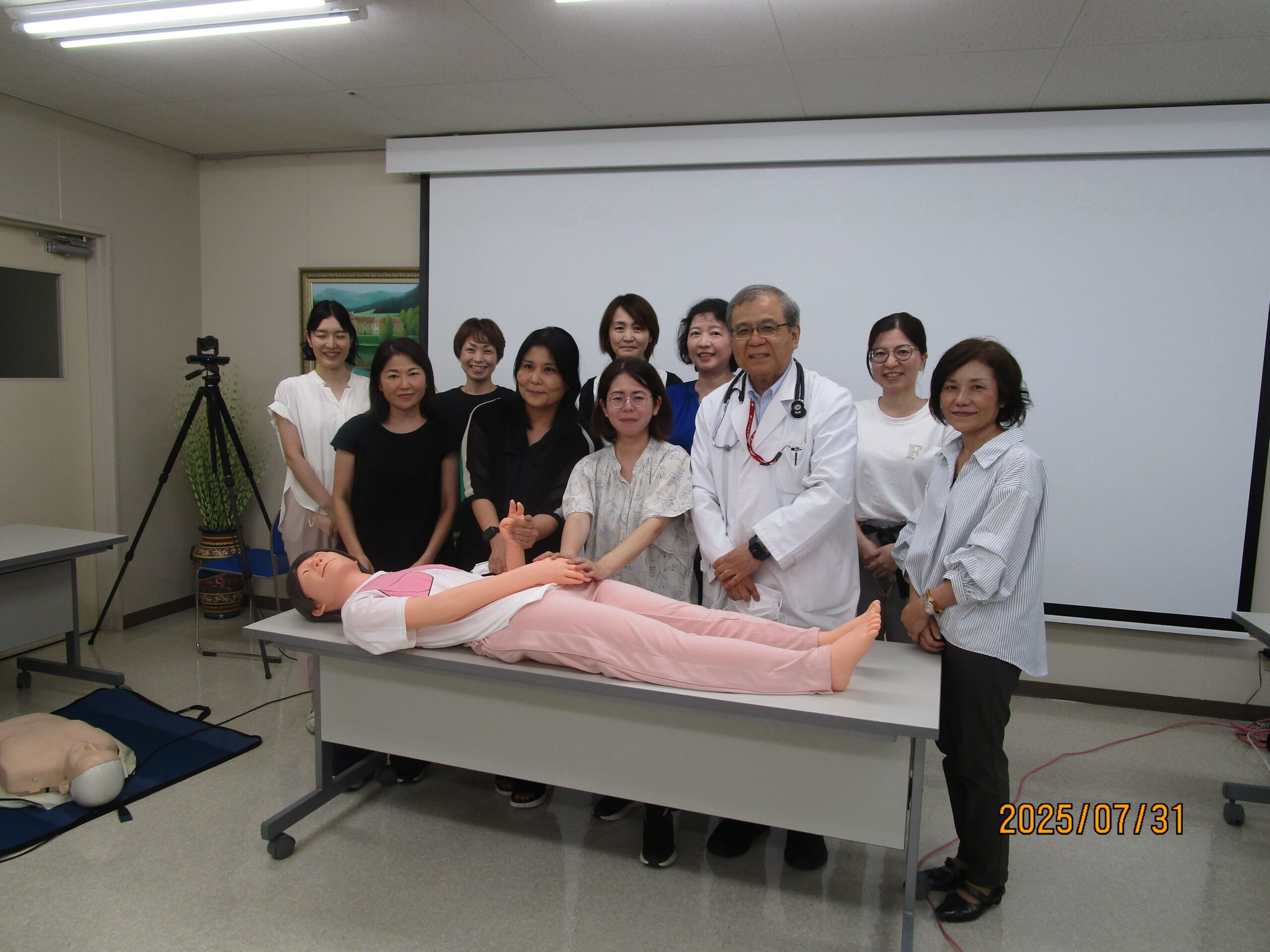 発熱対応について、異常の早期発見の観察ポイント、対応、そして救急蘇生法やハイムリック法の実演、実際の心音や肺音の聴取と盛りだくさんの研修内容でしたが和気あいあいとした有意義な研修会でした。