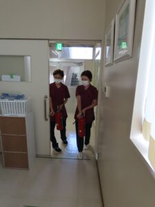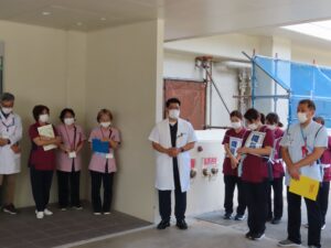 連携:サクラビア玄関横のスペースを本部として、各階からの避難状況の報告を受ける。(本部へ駆けつける階、窓越しにハンドスピーカーで報告する階)。そして、最後に3階健診センター玄関前に集合した。