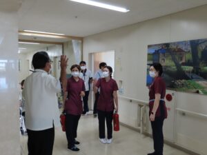 その中で強調されていること:病院の全職員がすべきことは①確実な初期消火対応②的確な避難誘導③職員のスムーズな連携である。これが、患者さんと自分たちの完全確保に繋がる。日頃の訓練院内防災手順の確認が大事である。