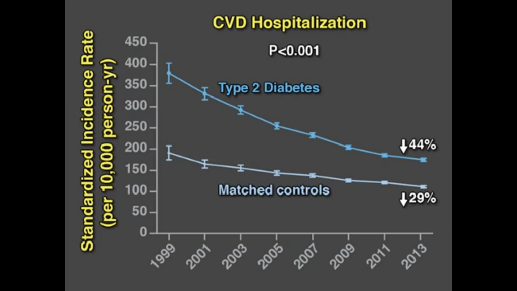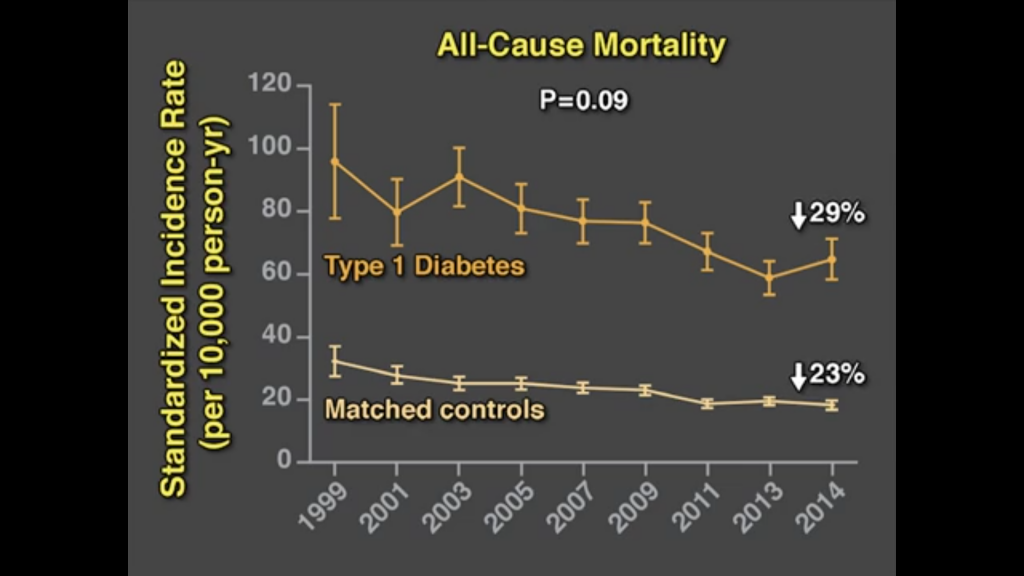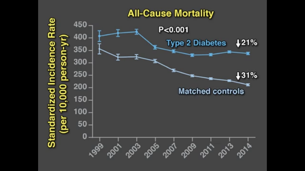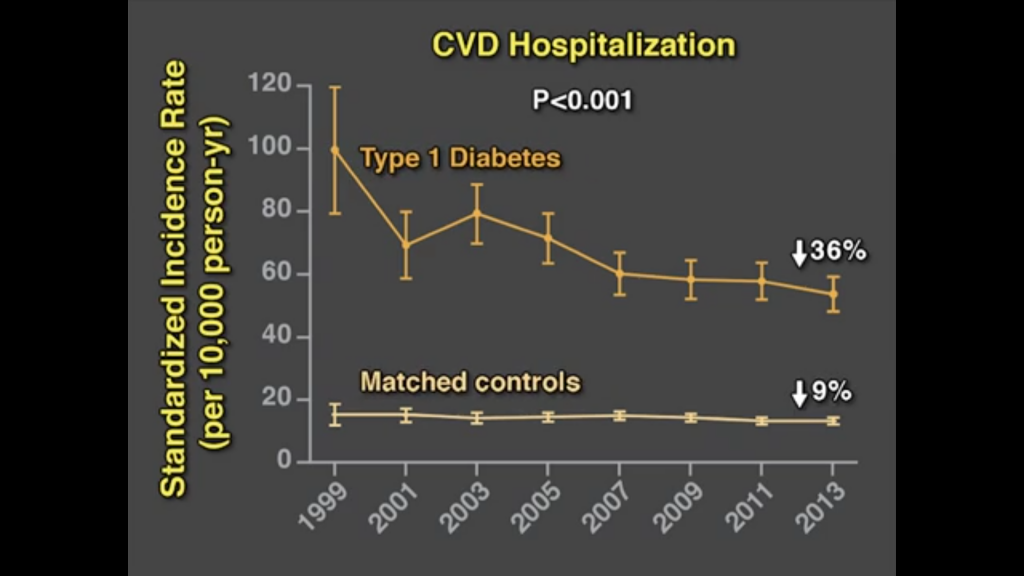 20世紀末に比べると、2014年では死亡率、心血管病による入院率は当然減っています。医療の進歩によるものでしょう。特に1型糖尿病の改善度は糖尿病以外の人の改善度に比べてかなり良いです。しかし2型糖尿病の死亡率はあまり良くなっていません。医療は進歩しても生活習慣の改善はまだまだという事でしょうか。