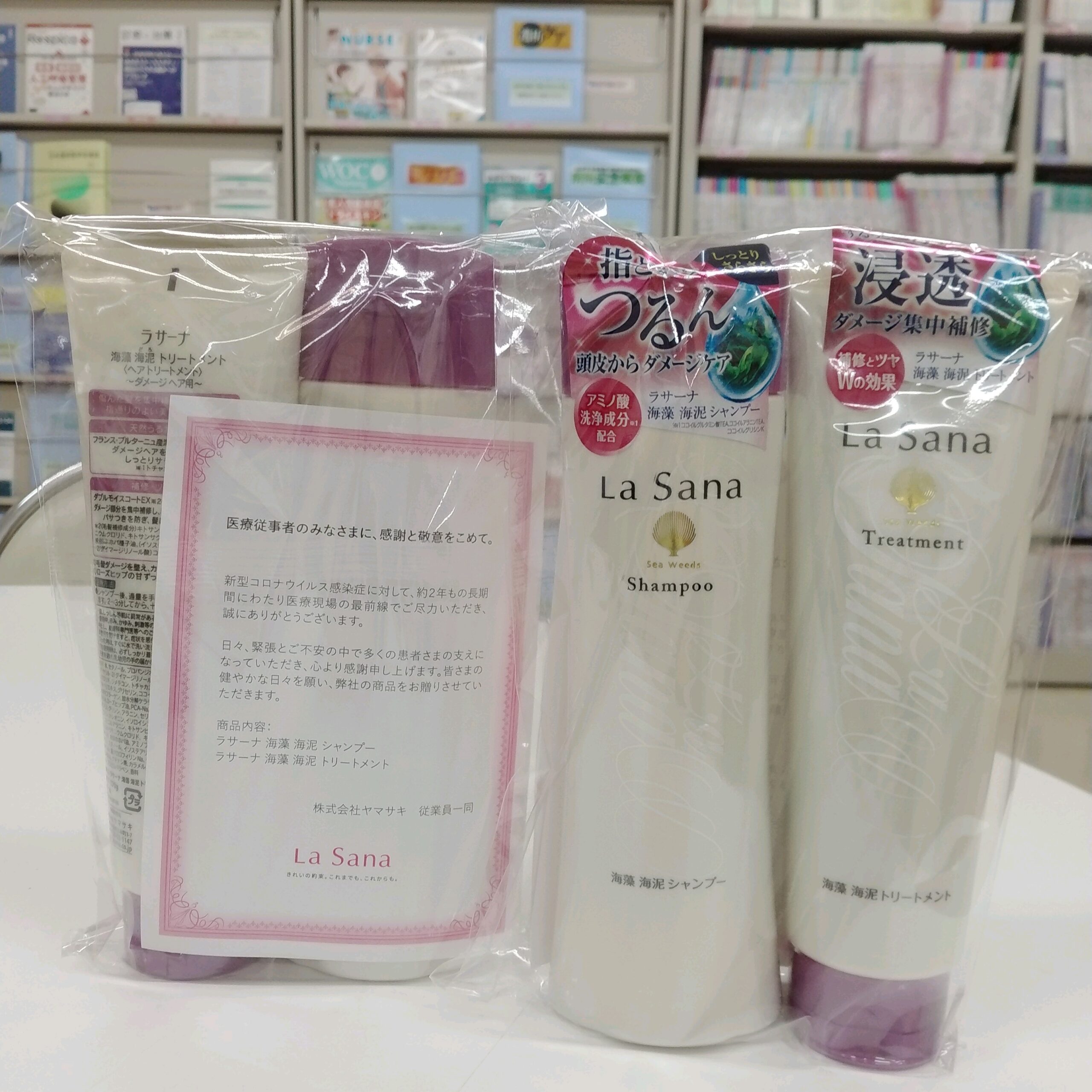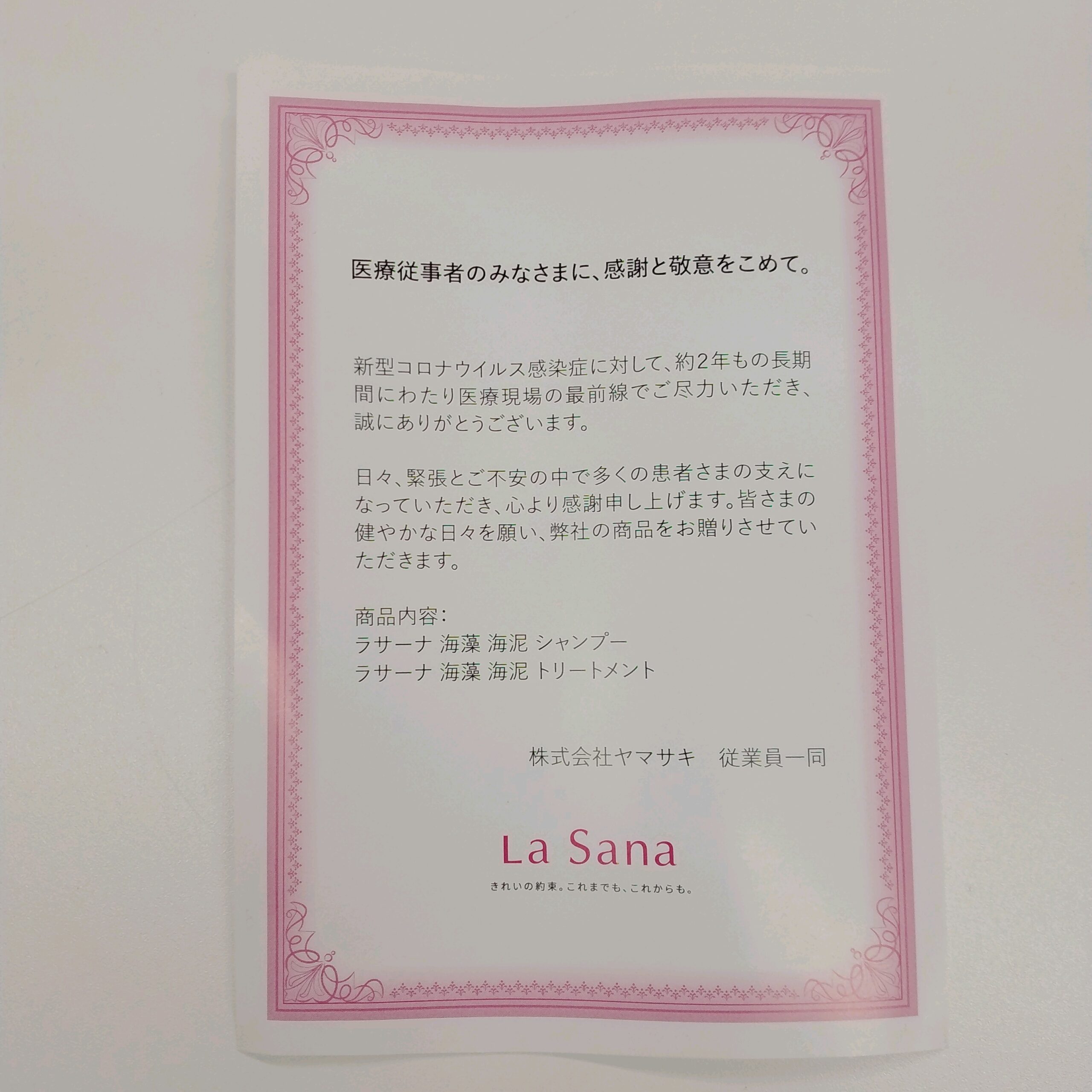 「医療従事者のみなさまへ、感謝と敬意をこめて」と「La Sana海藻海泥シャンプー&トリートメント」を送ってくださいました。