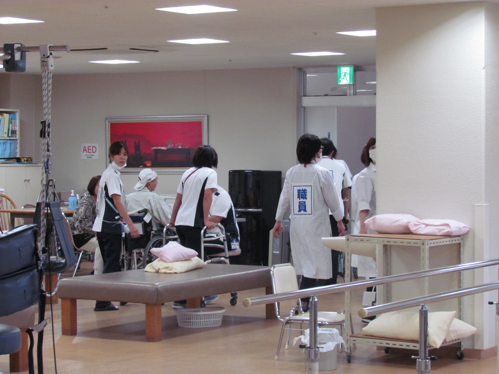 リハビリセンター、外来フロアから、避難誘導を行う様子