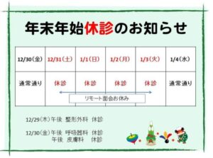 12月31日(金)から 1月3日(火)まで休診とさせていただきます