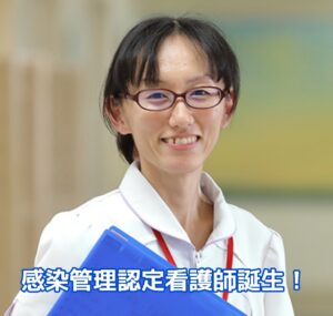 看護部としても念願の感染管理認定看護師です。これまでも感染対策に奔走していましたが、昨年12月から7ヵ月の感染管理の研修を終了し、厳しい資格試験に合格、感染管理認定看護師の誕生です。