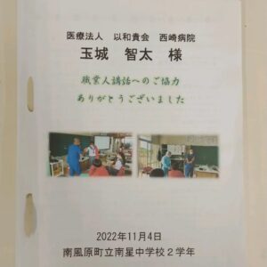 当院看護師の玉城智太師長が、11月4日(金)南星中学校で開かれた「職業人講話」