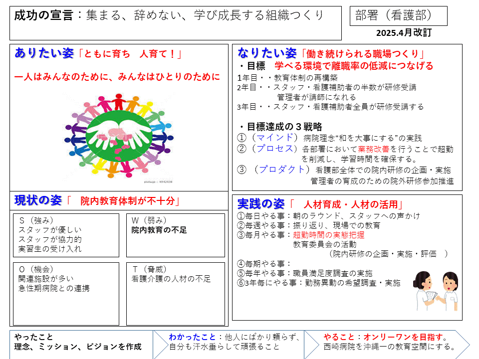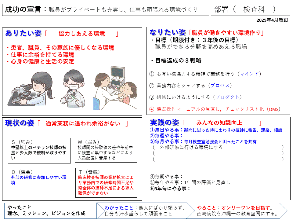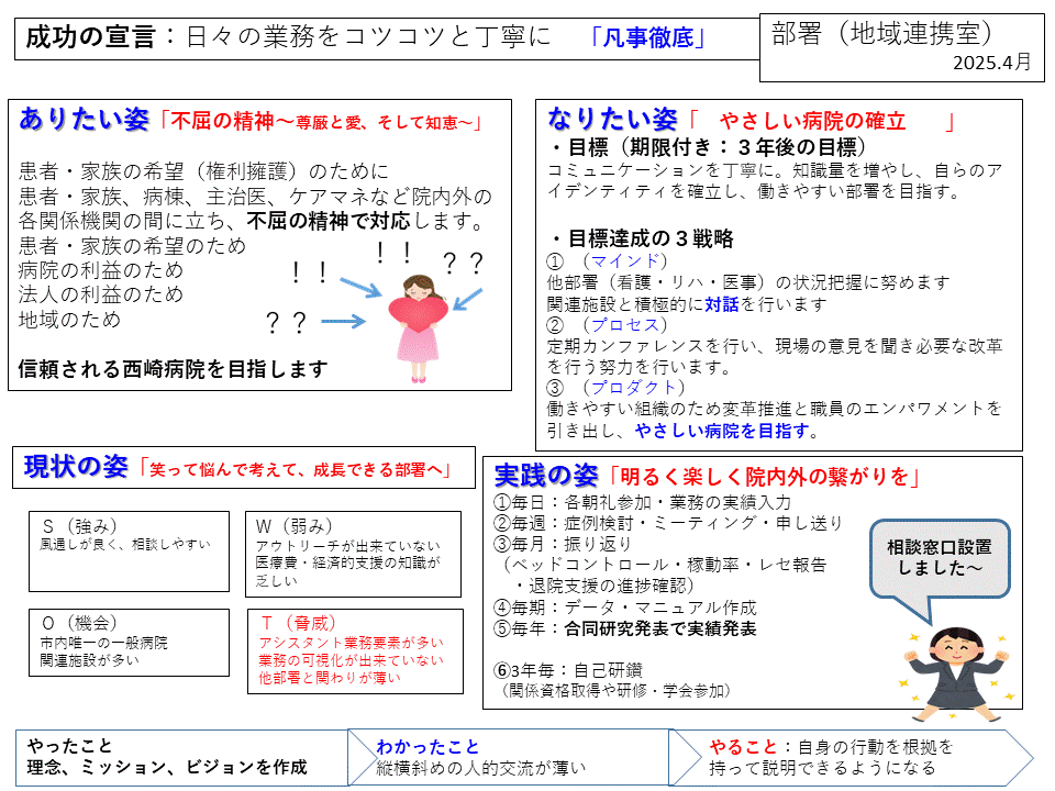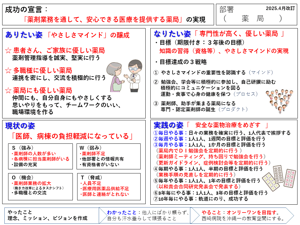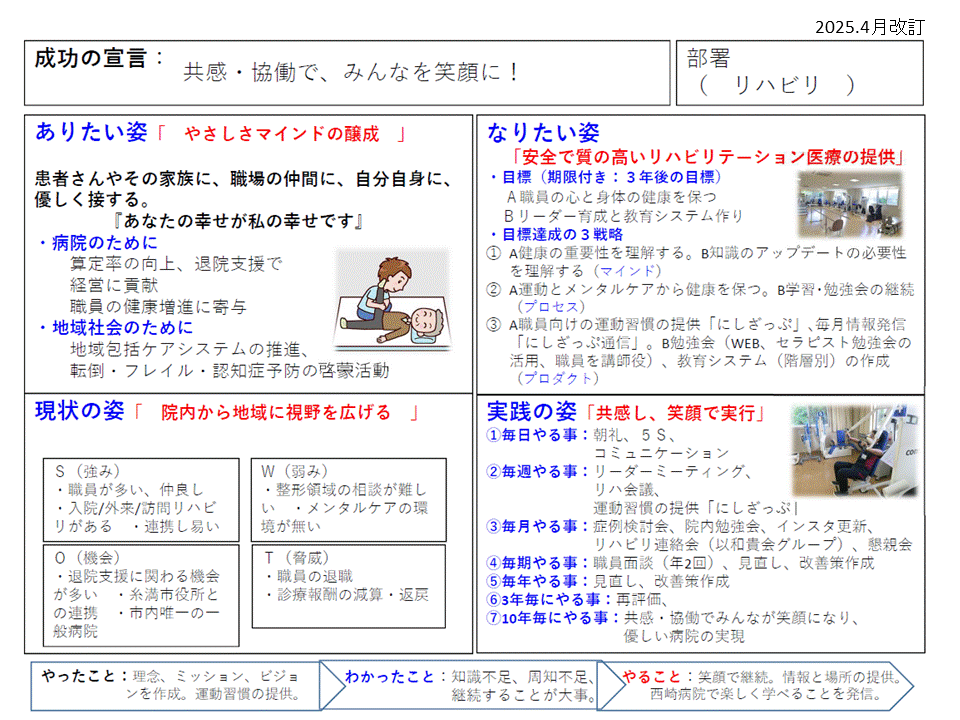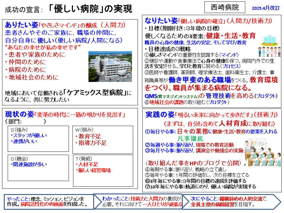 当院の理念である「優しい病院」を目指して、職員一同、力を合わせて頑張いきましょう。(今回の改訂に合わせて、各部門の四画面思考、医療の質マネジメントシステムに関する考え方を掲載いたします。ぜひご一読ください)、