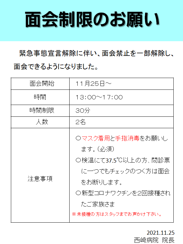 面会制限のお知らせ 2021年12月3日 1名/15分から2名/30分になりました! ※日曜日に面会する方は、サクラビアの正面玄関からお入りください。 必ず手指消毒と検温、検温シートの記入をお願いします。守衛に入院患者病棟を伝えから病棟へお上がりください。
