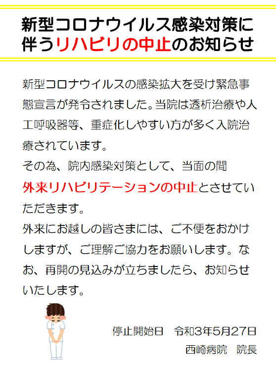 外来にお越しの皆さまには、ご不便をおかけしますが、ご理解ご協力をお願いします。なお、再開の見込みが立ちましたら、お知らせいたします。