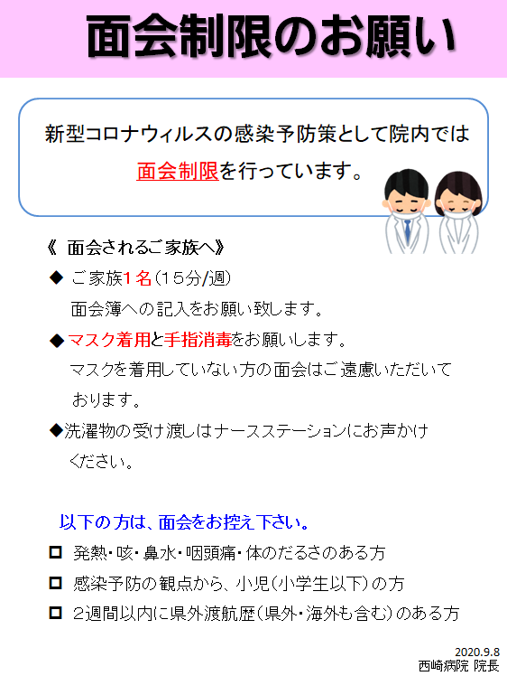 面会制限のお願い 2020年9月26日 面会制限が面会禁止から ご家族1名(15分/週)に変更になりました。 引き続き正面玄関での『検温実施中』のため 外来受診・面会の方は 西崎病院1階正面玄関より出入りお願いします。 マスクをお忘れの方は売店で販売しています。 ご協力よろしくお願いします。