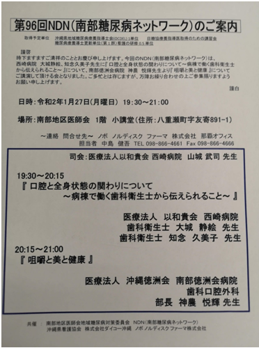 糖尿病だけではなく、体全体に歯が関わっていることはもう常識になりつつあります。今回は、それを再認識する良い機会になりました。講師の大城さん、知念さん、また神農先生、大変ありがとうございました。