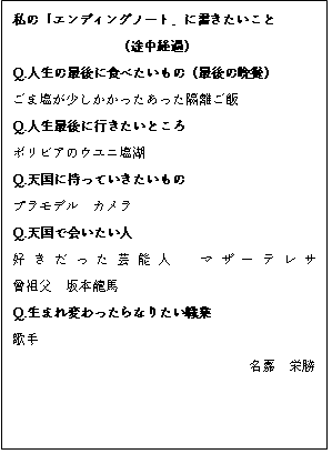エンディングノートと遺書と違います。「自分のこれからの人生をどう生きるかを考えるため」のノートで、自分の生きた証を遺す、家族が困らないようにエンディングに関する自分の考えを伝える。自分自身の備忘録となるものです。家族へのメッセージや介護・医療の希望、財産相続・遺言の有無、争議・墓の希望が主な項目です。東恩納さんは年に1回誕生日に更新・書き換えすることを勧めていました。ただしエンディングノートには法的効力はなく、注意が必要です。