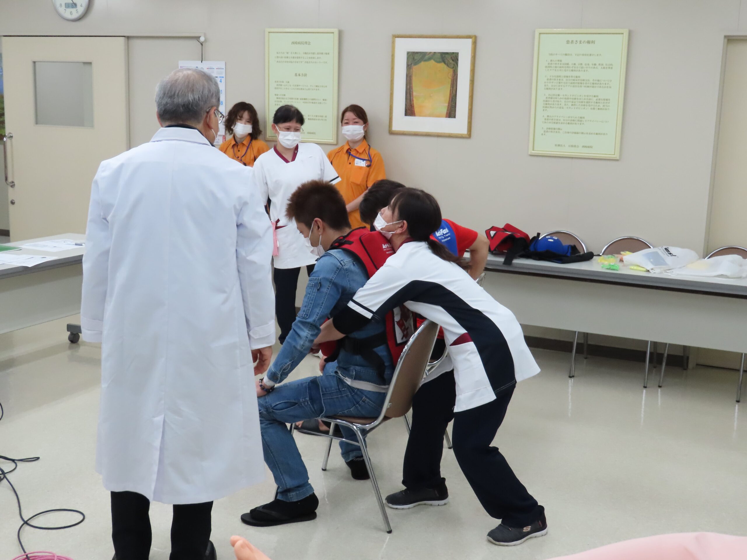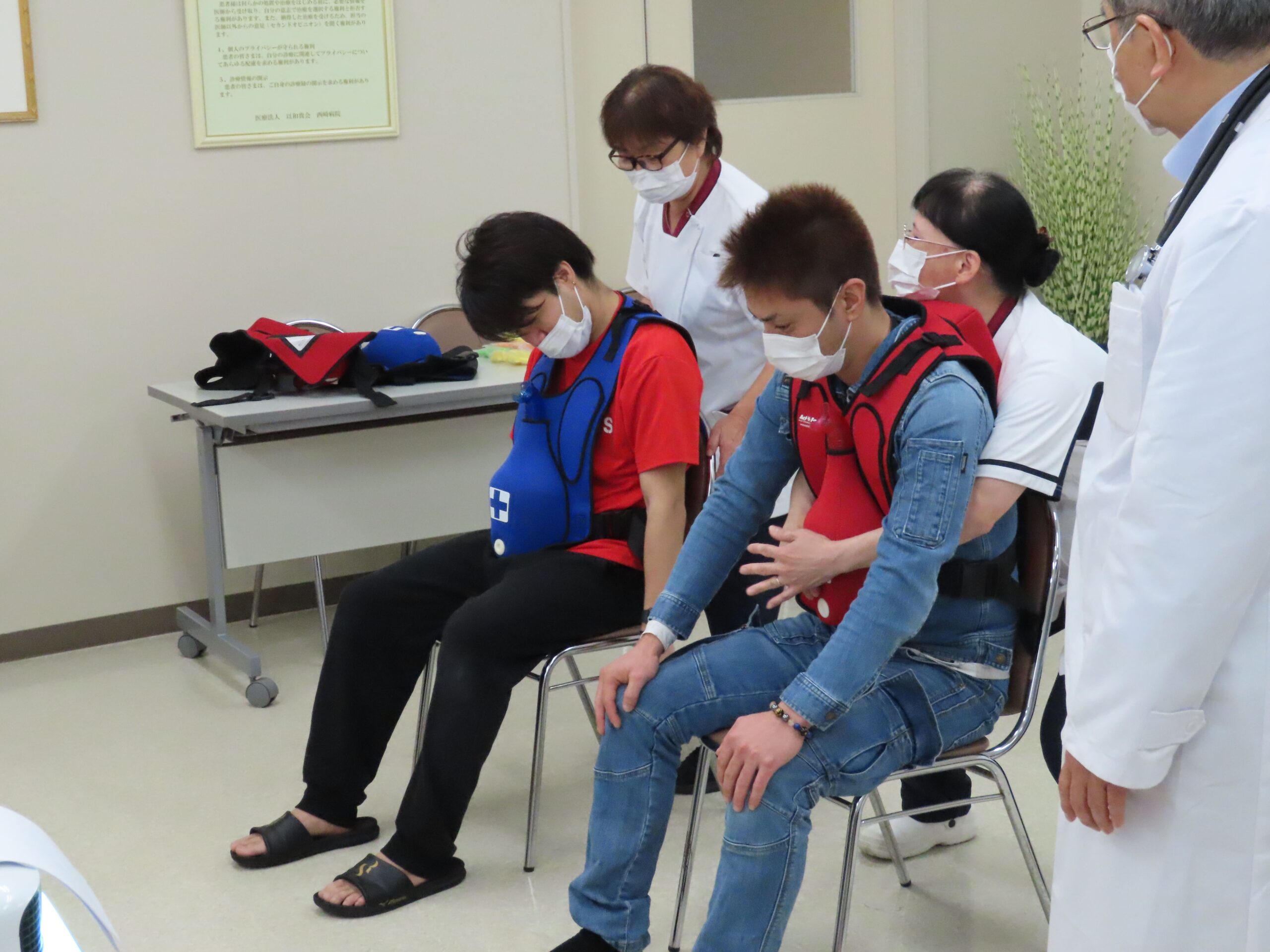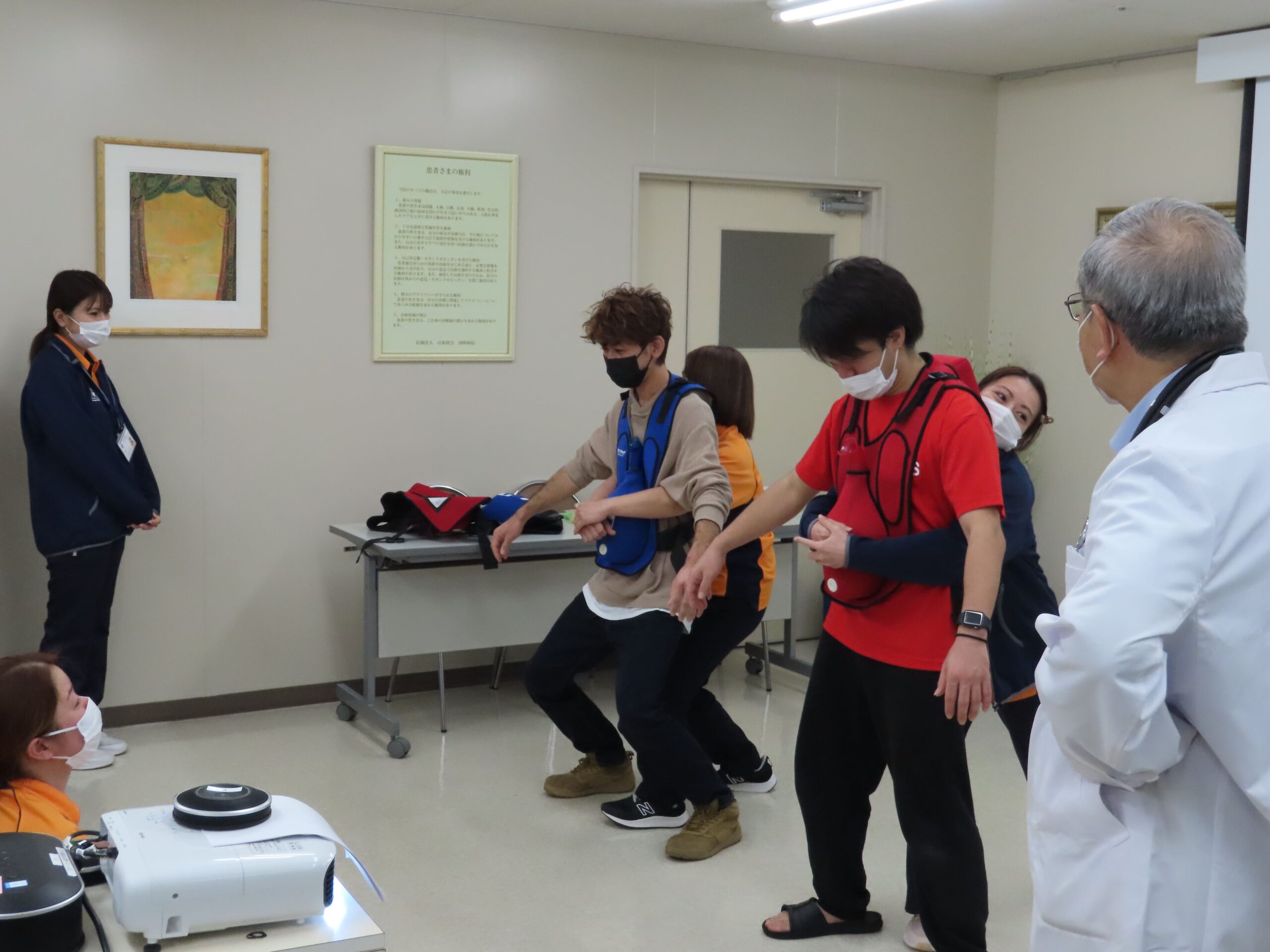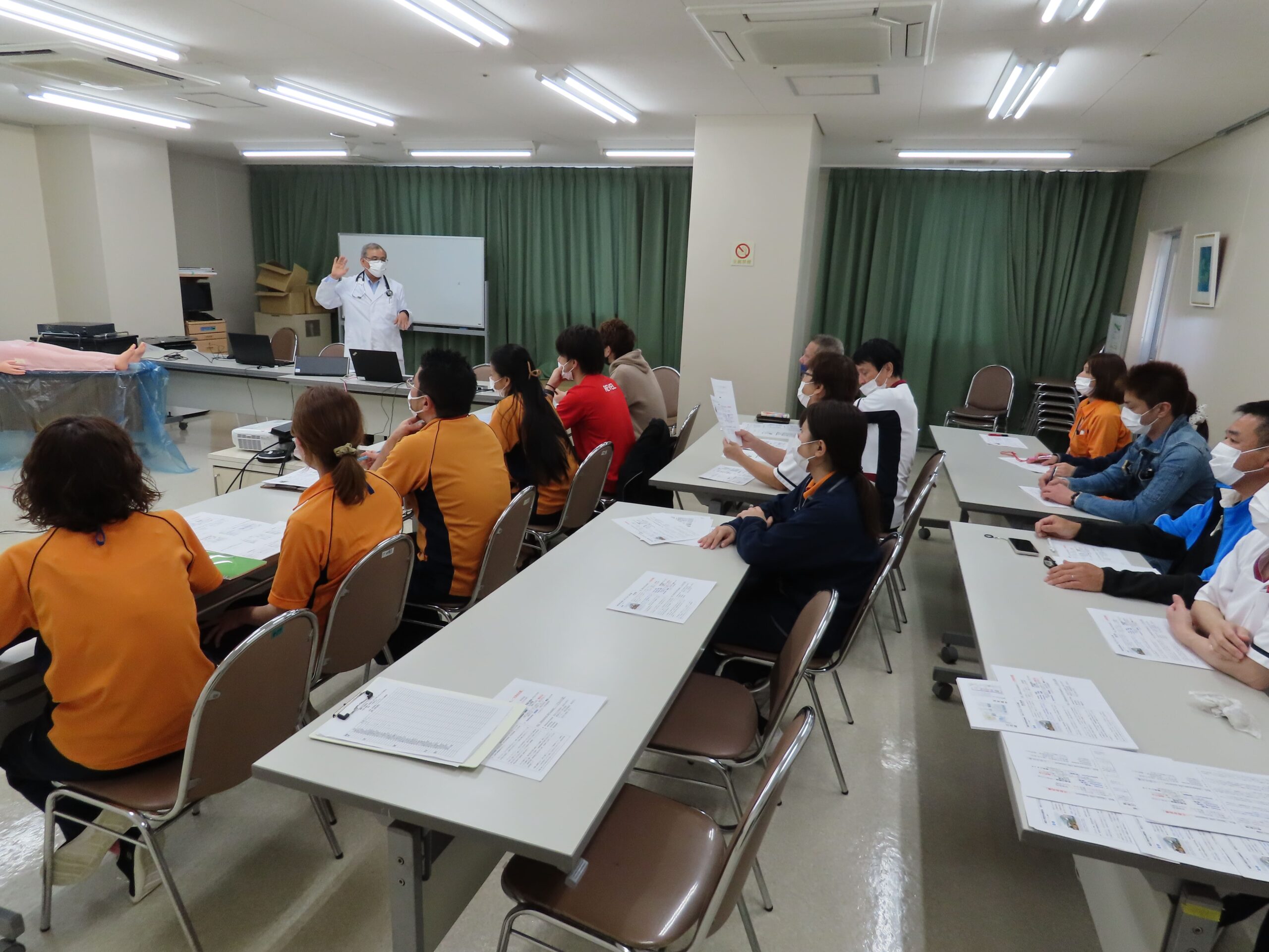 - ハイムリック法(喉に異物を詰まらせた時の対応):まずは咳を促す、それでも改善しない場合は背中を叩く、さらにハイムリック法を施行する(立位と座位の場合を体験)