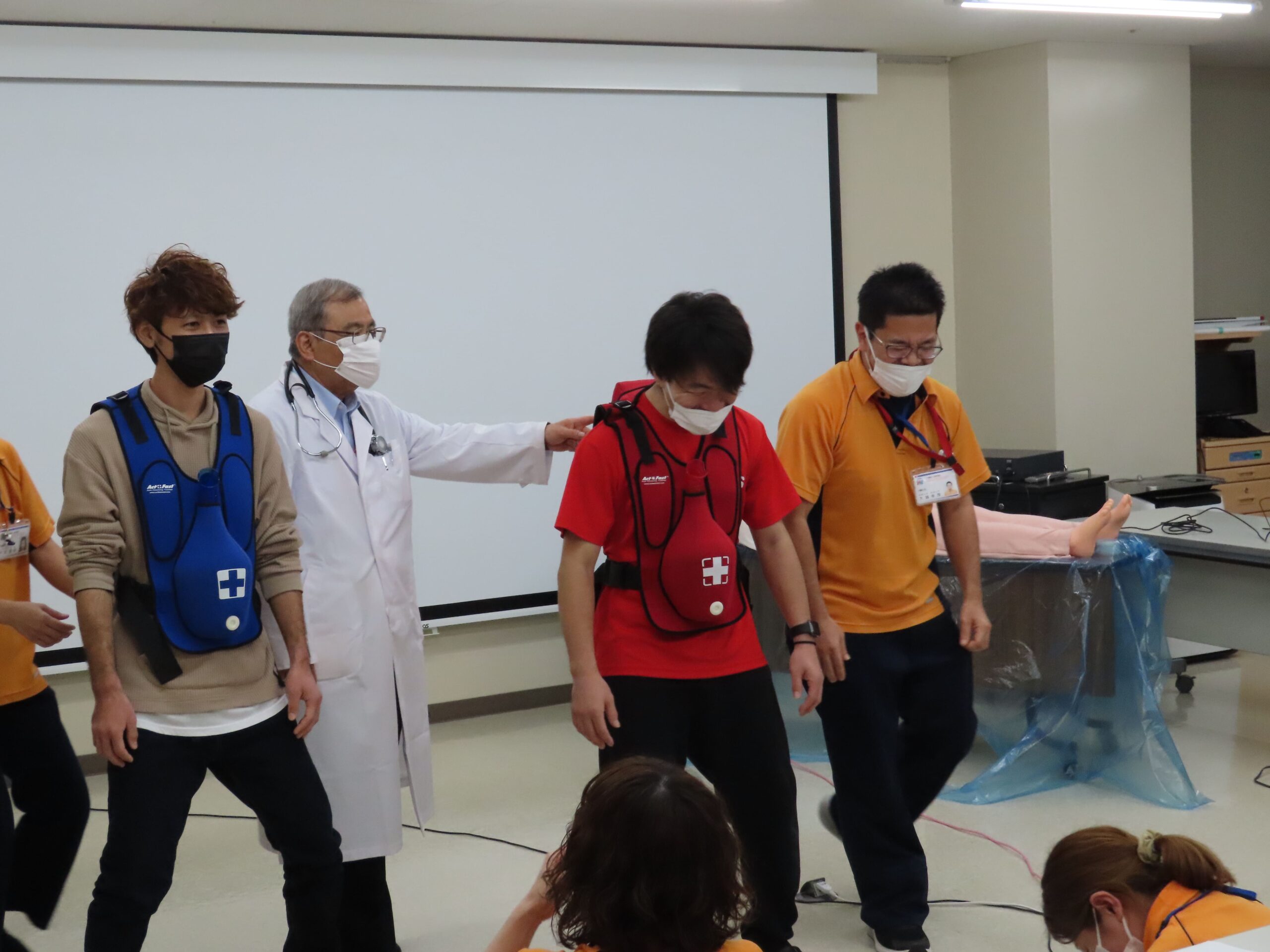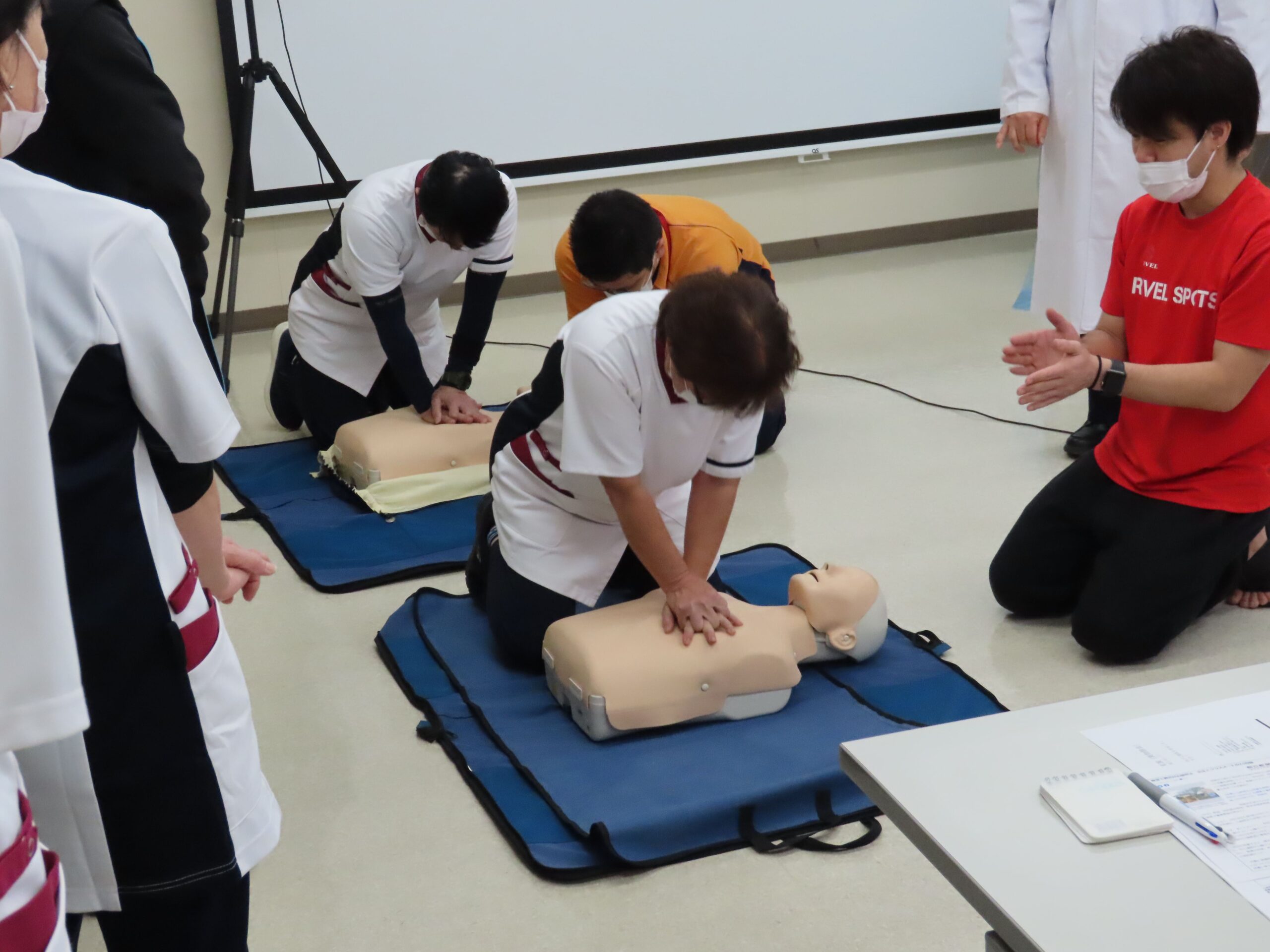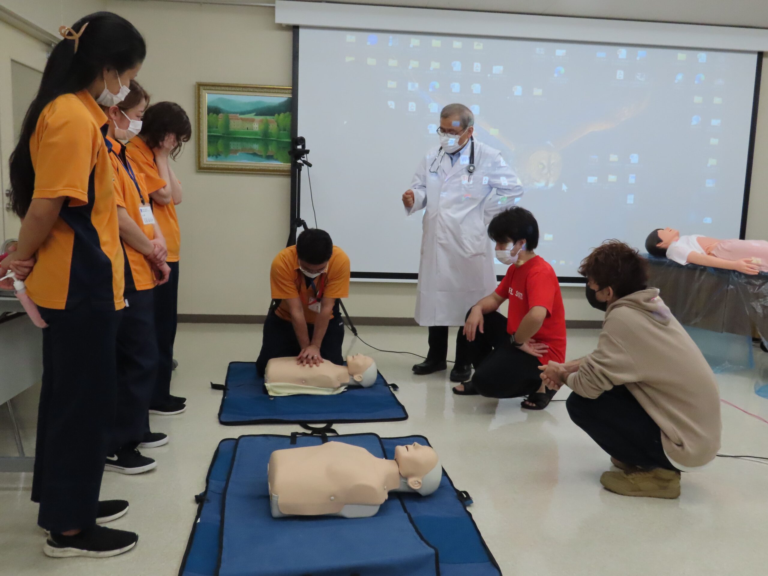 - 心肺蘇生法(心停止への対応):特に、心マッサージ(胸骨圧迫)ができようにする。