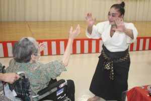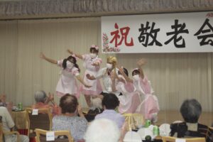 参加した皆さんからは「私も100歳まで頑張るよ」「今度は私も踊ろうかね」「腰の痛みが無くなる位楽しかった」などの感想があり、余興の練習や敬老会の準備に頑張ったスタッフへの労いの言葉にもなりました。