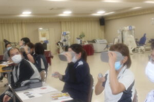 かなりリアルな体験をできるので参加者はワクワクしながら学んでいました。日頃から介助している場面でもしかすると配慮にかけていたのではないか、こうするともっとよい介護ができるのではないかと考え直す良いきっかけとなりました。