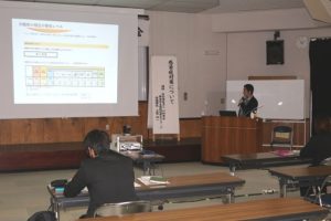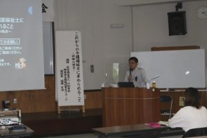 玉城伸一課長は昨今のコロナウイルス感染症対策で福祉施設の取り組みと現状を報告し、情報共有と共通認識を行いました。そして、城間施設長の講義では、ICFの理解、個人因子と環境因子が生活機能に与える影響などわかりやすく解説しています。また、介護業務は生産と消費が同時に行われる「一発勝負」であり、だからこそ介護福祉士の専門的な技術と知識が重要で、そこが魅力と話していました。